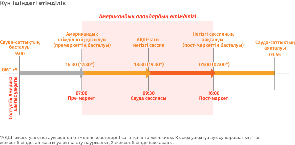 Екіншіден, Астана уақыты бойынша таңертең ITS платформасында амеикалық жабылу аукционының және пост-маркеттегі қалыптасқан бағаларын көре аласыз. Демек, Америка әлі ұйқыда жатқанда, сізде дәл осы жабылу бағасы бойынша мәміле жасауға бірегей мүмкіндік бар. Бұл әсіресе елде, әлемде немесе эмитентте елеулі жағдай орын алған кезде маңызды.